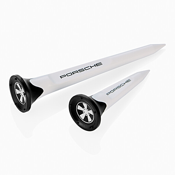 • Een korte en een lange tee met Porsche-opschrift en een rubberen kop in de vorm van het klassieke Porsche 5-spaaks wiel.
